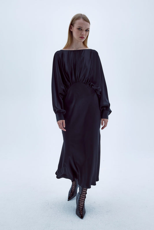 Emillien Asymmetric Satin Dress in Noire
