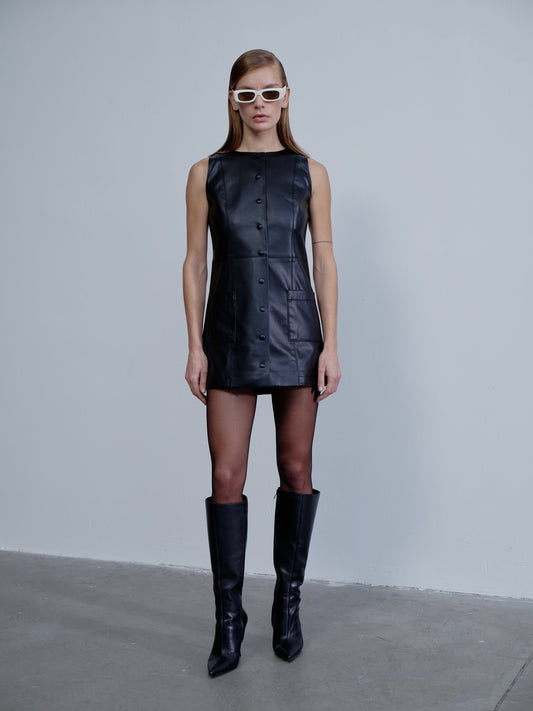 Odette Vegan Leather Mini Dress in Noire