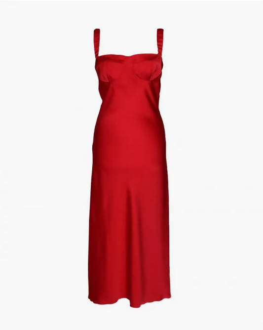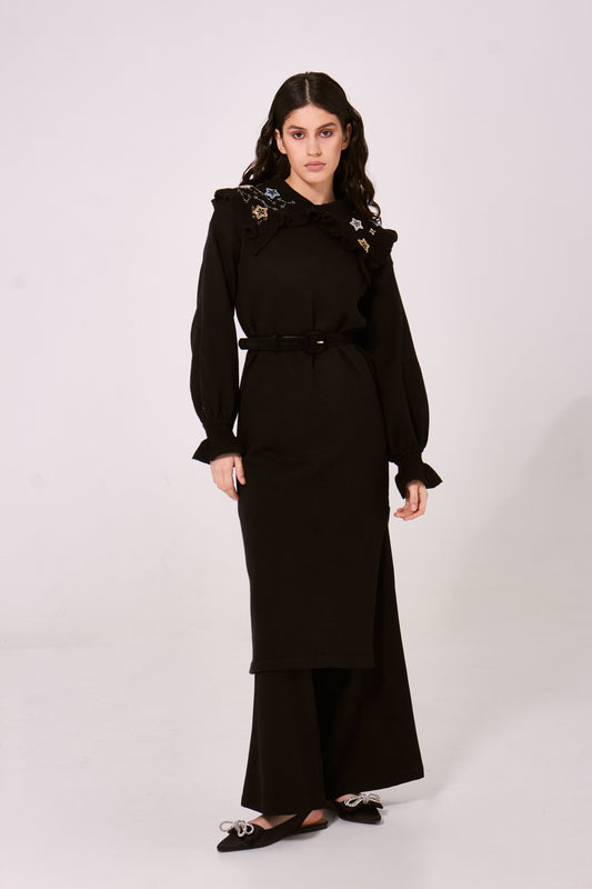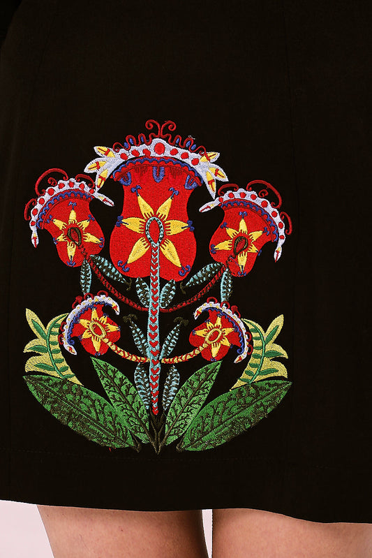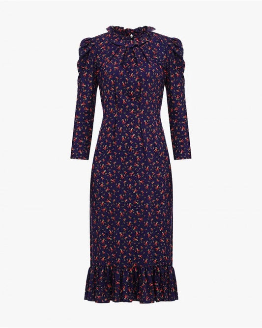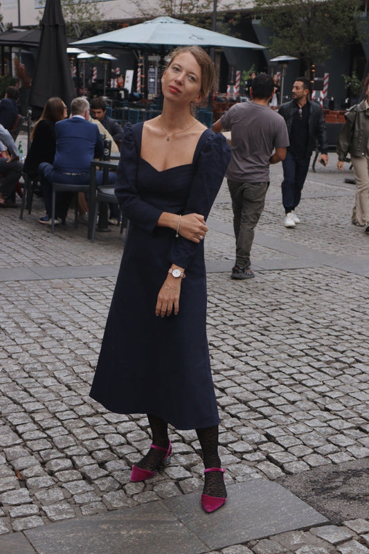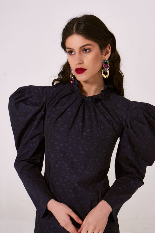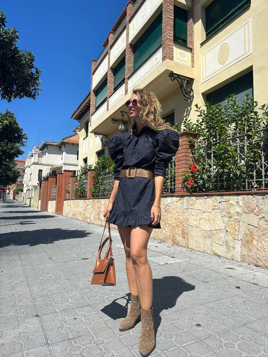 Silhouette high-waisted dress with buff sleeves and embroidered waistline