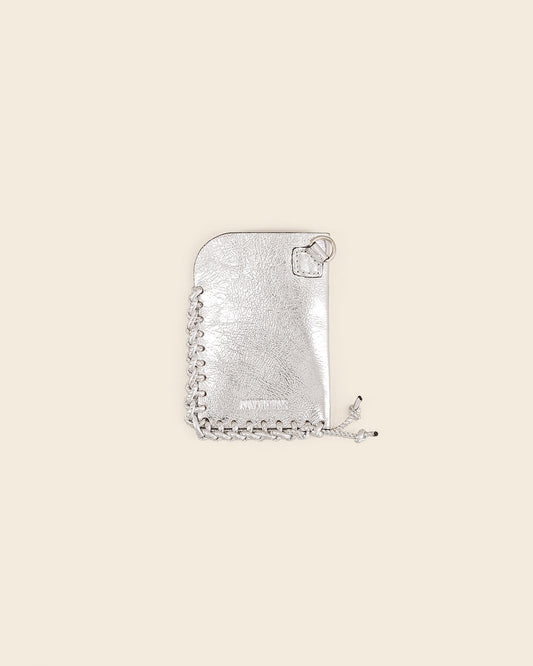 KIBO - Card holder in crumpled silver metallic leather & silver leather braiding