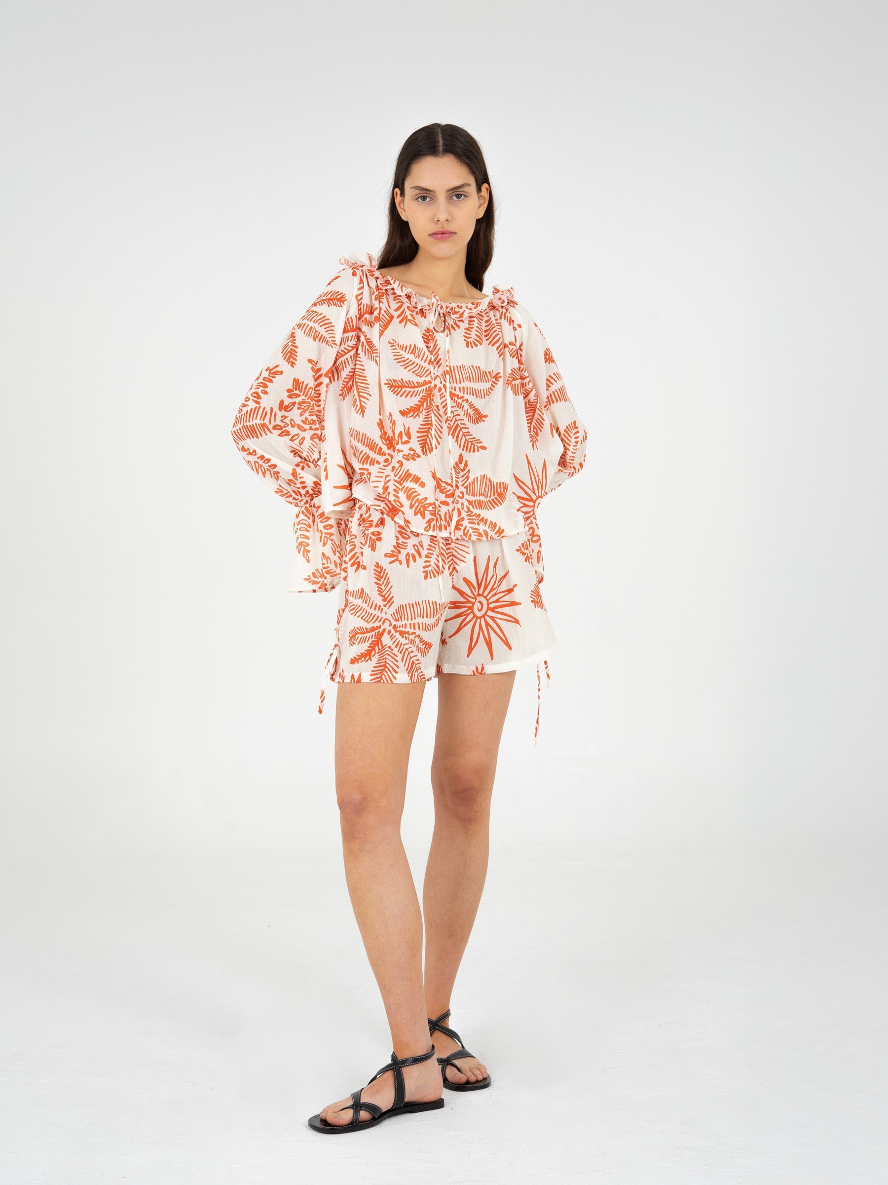 Blouse with a palm tree print in shades of orange. Loose-fitting design with long puff sleeves, a gathered neckline with an adjustable drawstring, and a ruffle detail at the neckline.