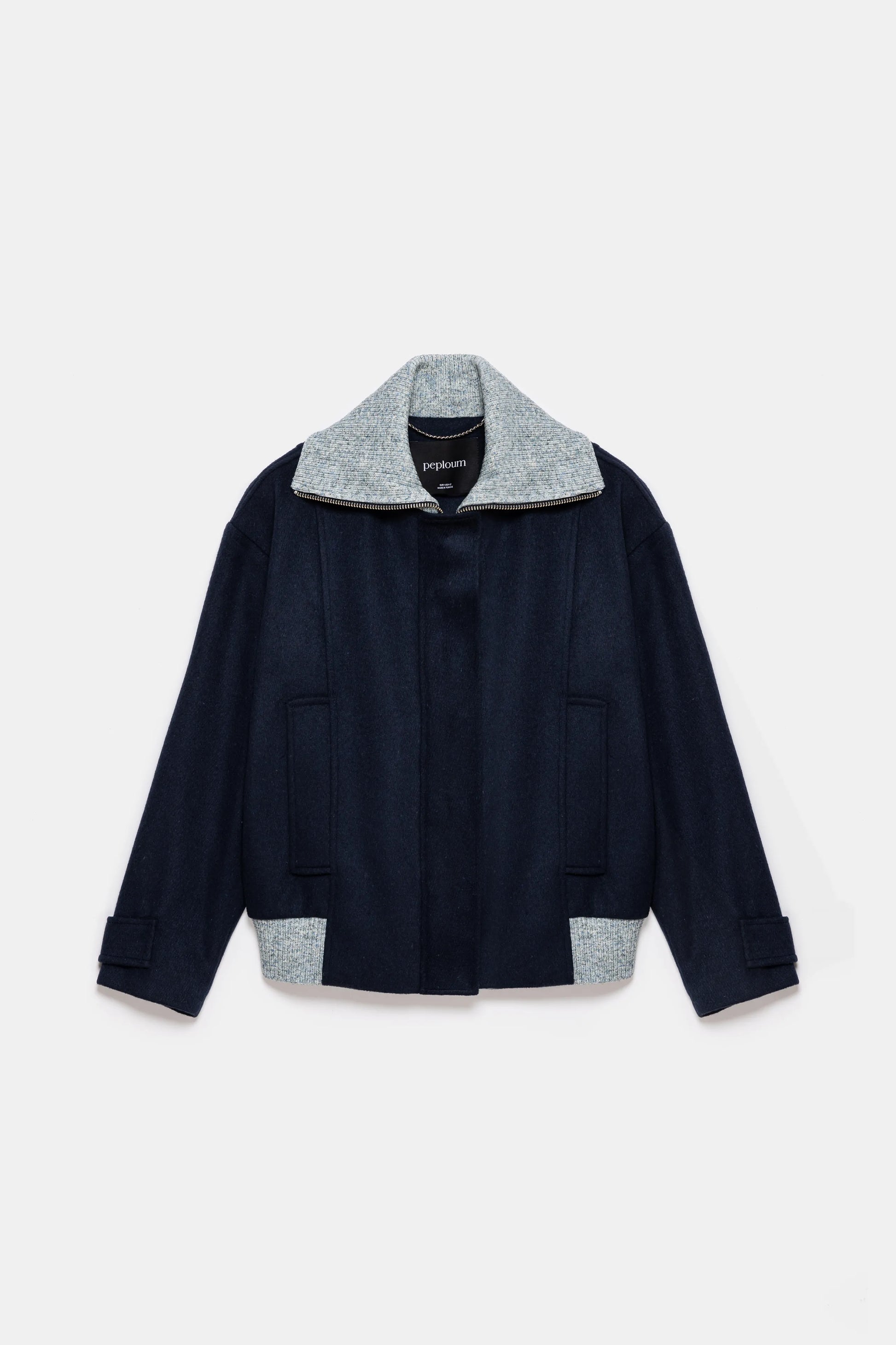This coat, designed in the season's most trendy colors, navy blue and beige, catches the eye with its knitted details on the collar and waist. Two side pockets on the front add convenience, while also contributing to its modern and timeless look. The coat features a zipper closure and belted cuffs on the arms.