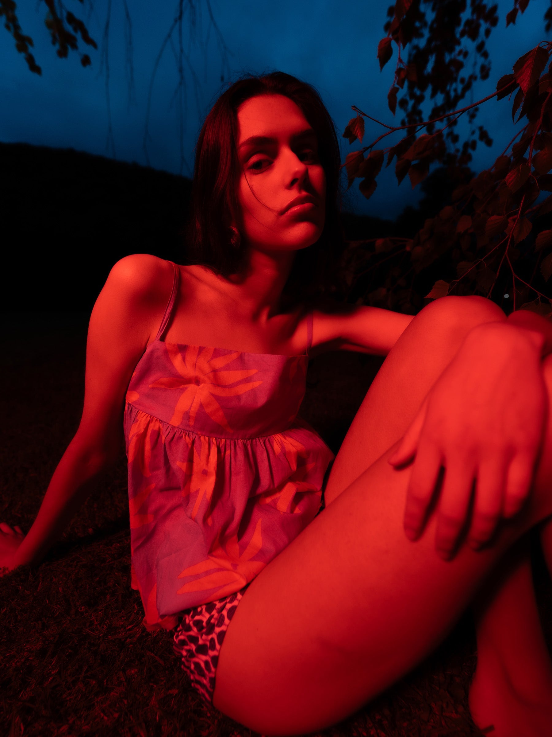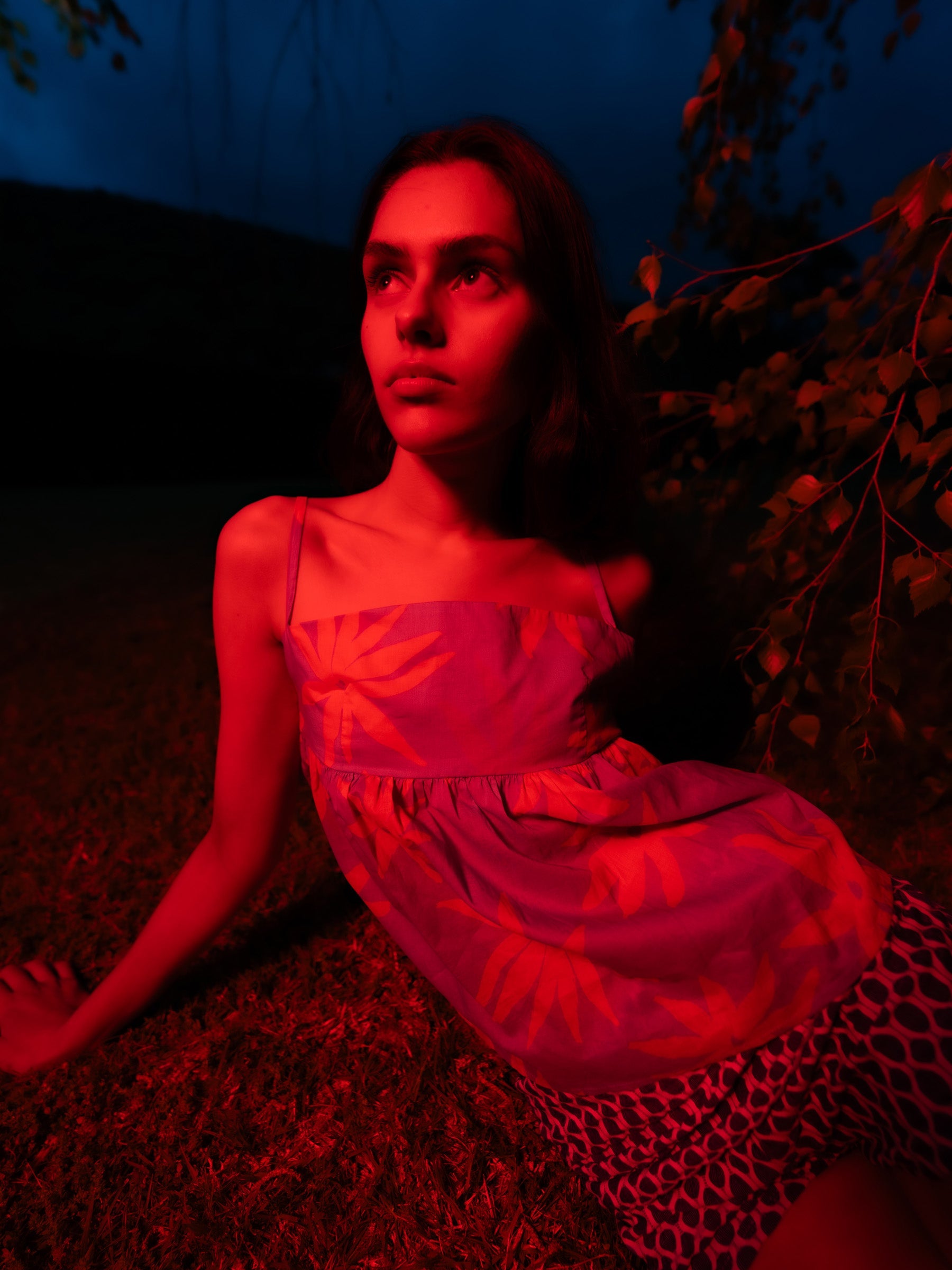 Floral print top with thin, adjustable straps, a straight neckline, and a full, flared bodice. Invisible side zipper closure.