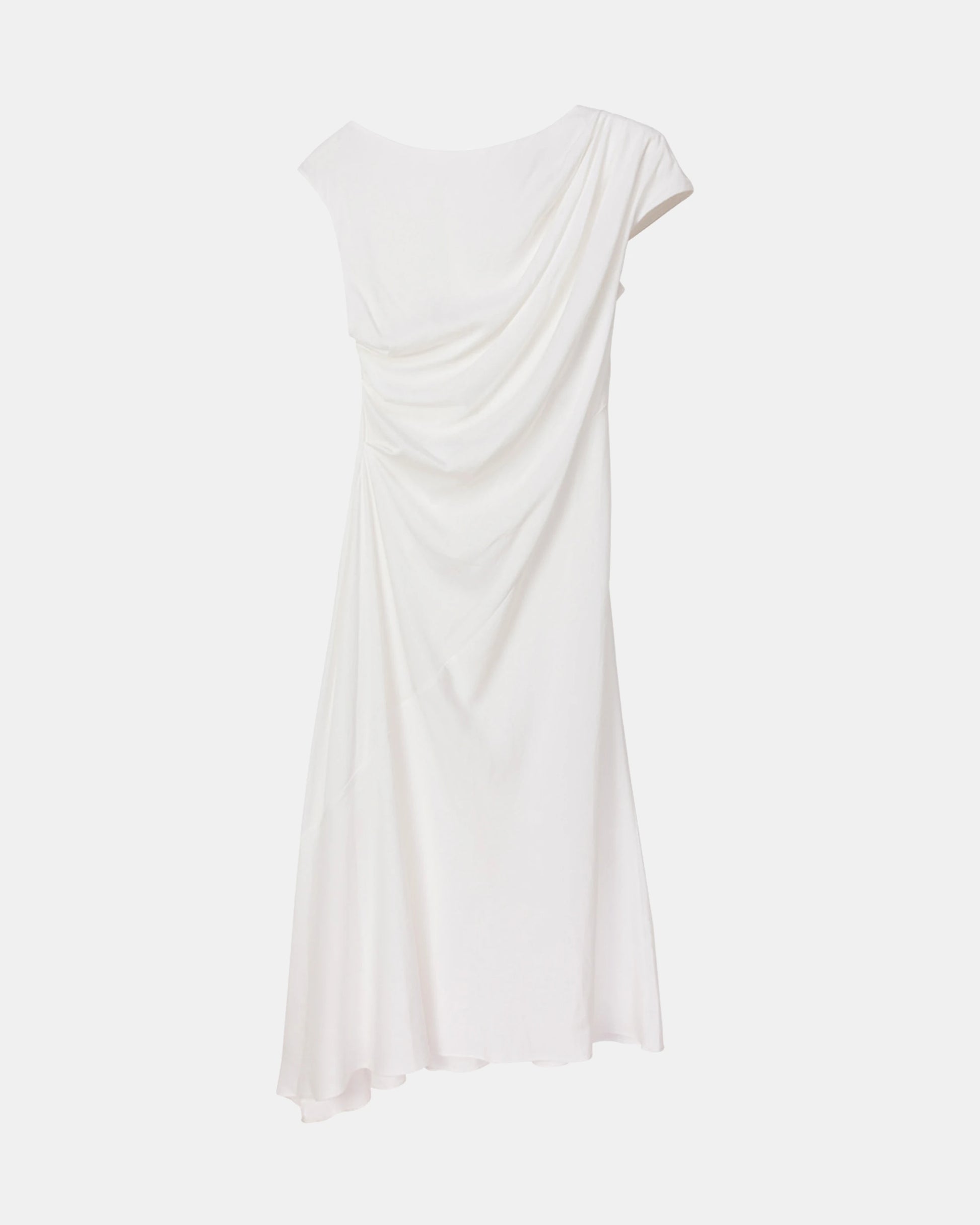 The dress features draping on the sides and shoulders, with the unique touch of asymmetrical dropped shoulders and asymmetrical cut hem. Considering the soft texture of the dress fabric, we're confident this piece will be essential for the summer season. There are two different color options available.