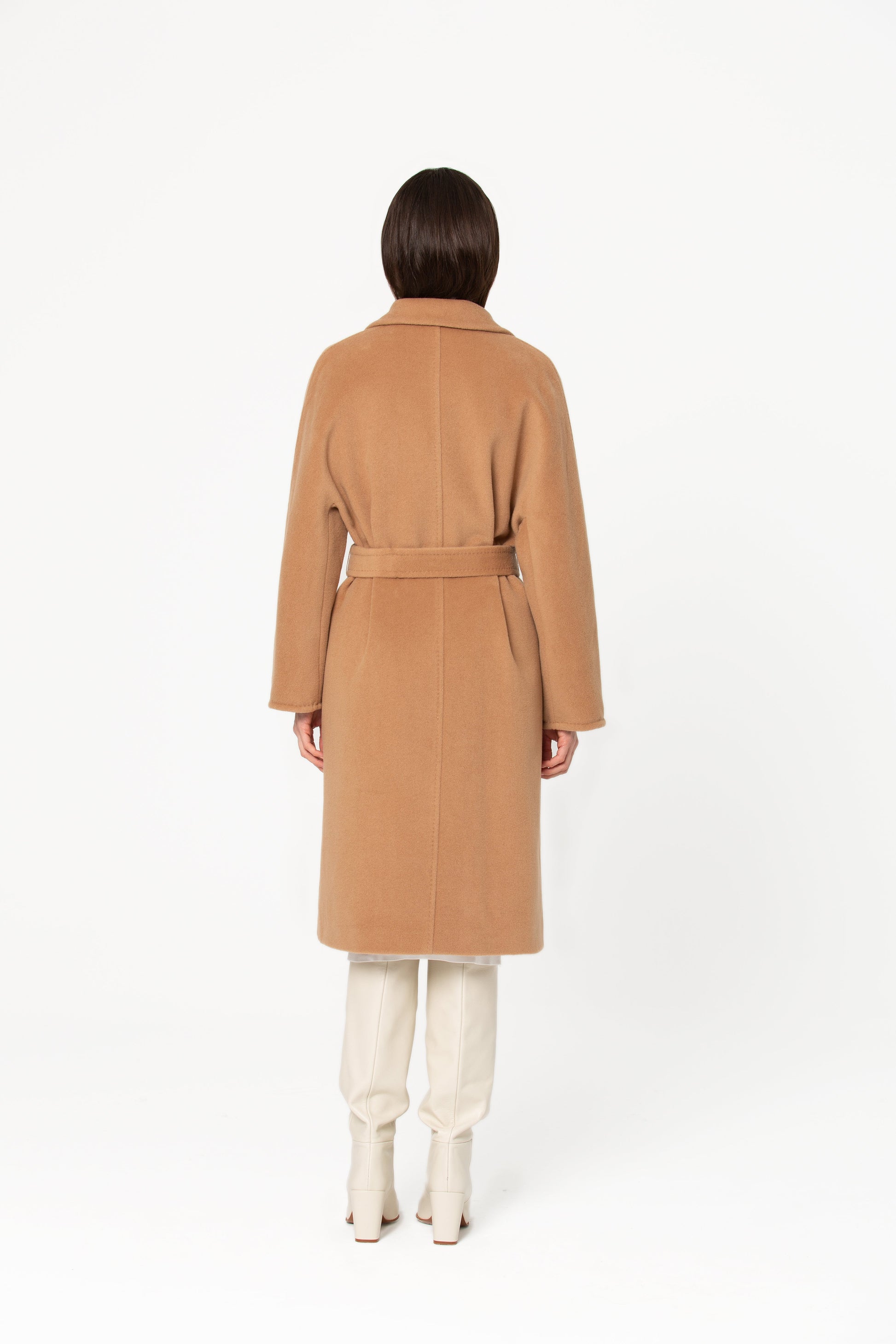 This luxurious Wrap coat is crafted from a blend of 80% Australian Wool and 20% Cashmere, ensuring a soft and warm feel. The coat is meticulously designed with a cozy touch, featuring a full lining for added comfort. It is equipped with two front seam pockets, adding both functionality and style to this elegant piece.