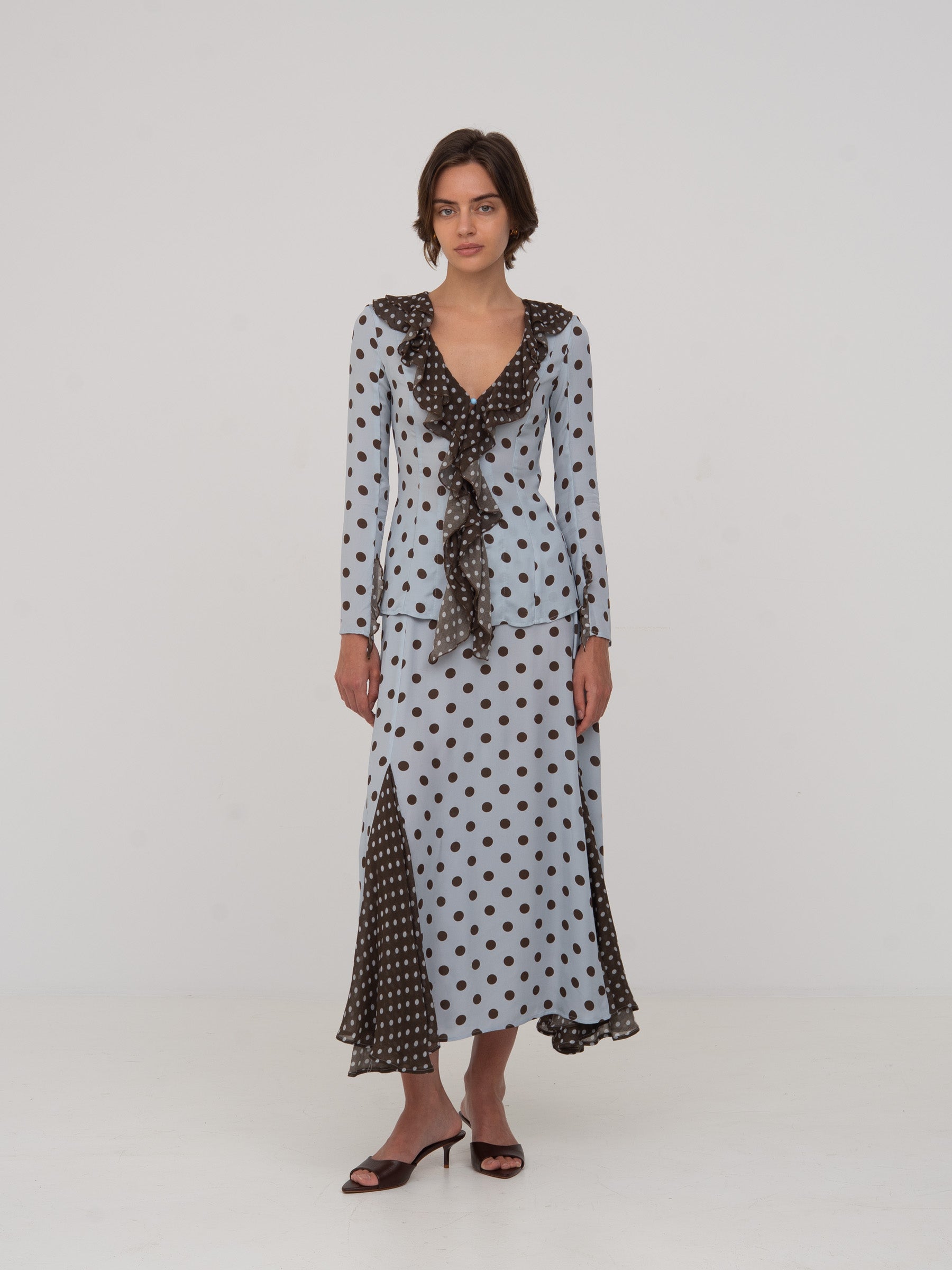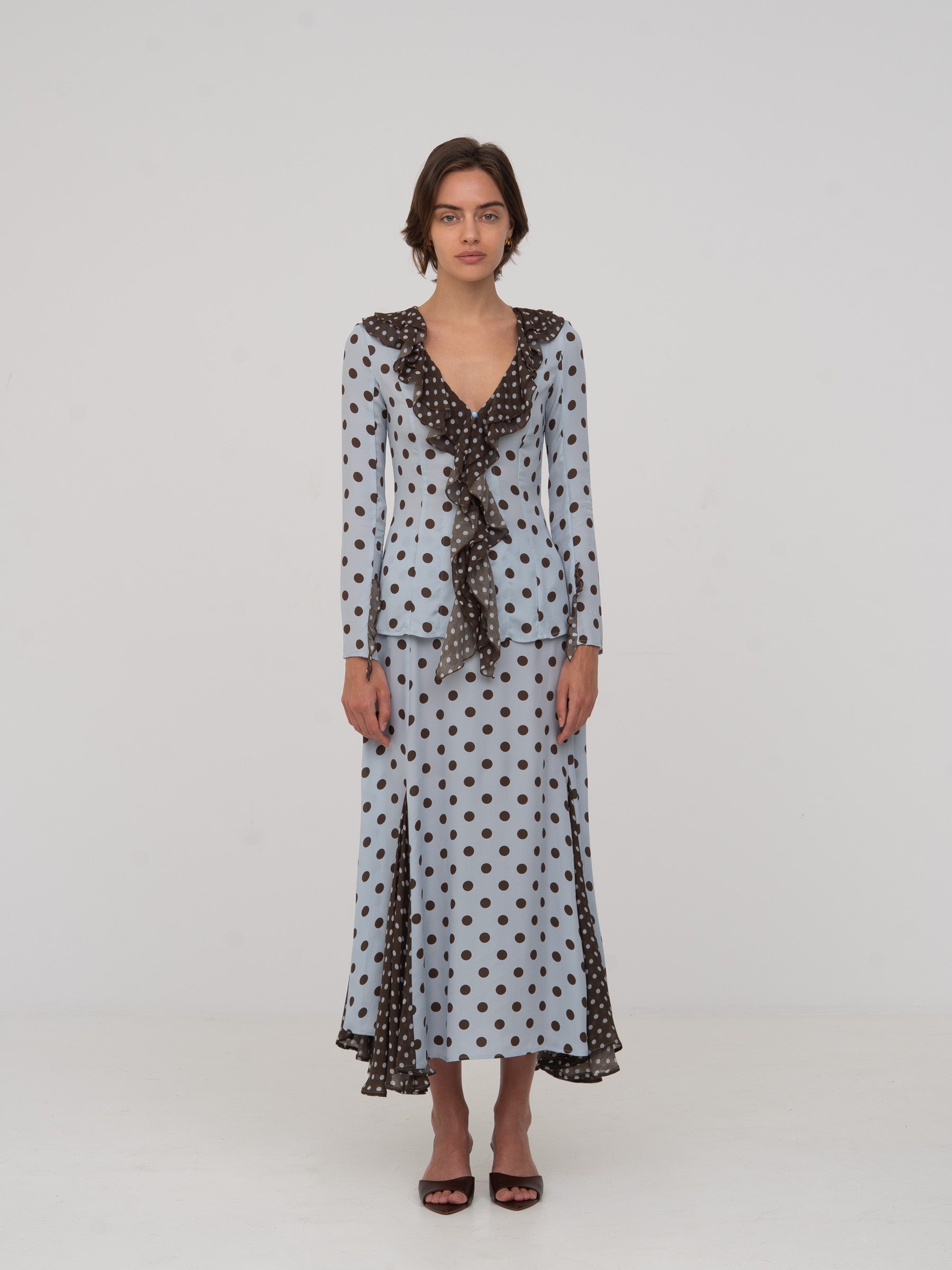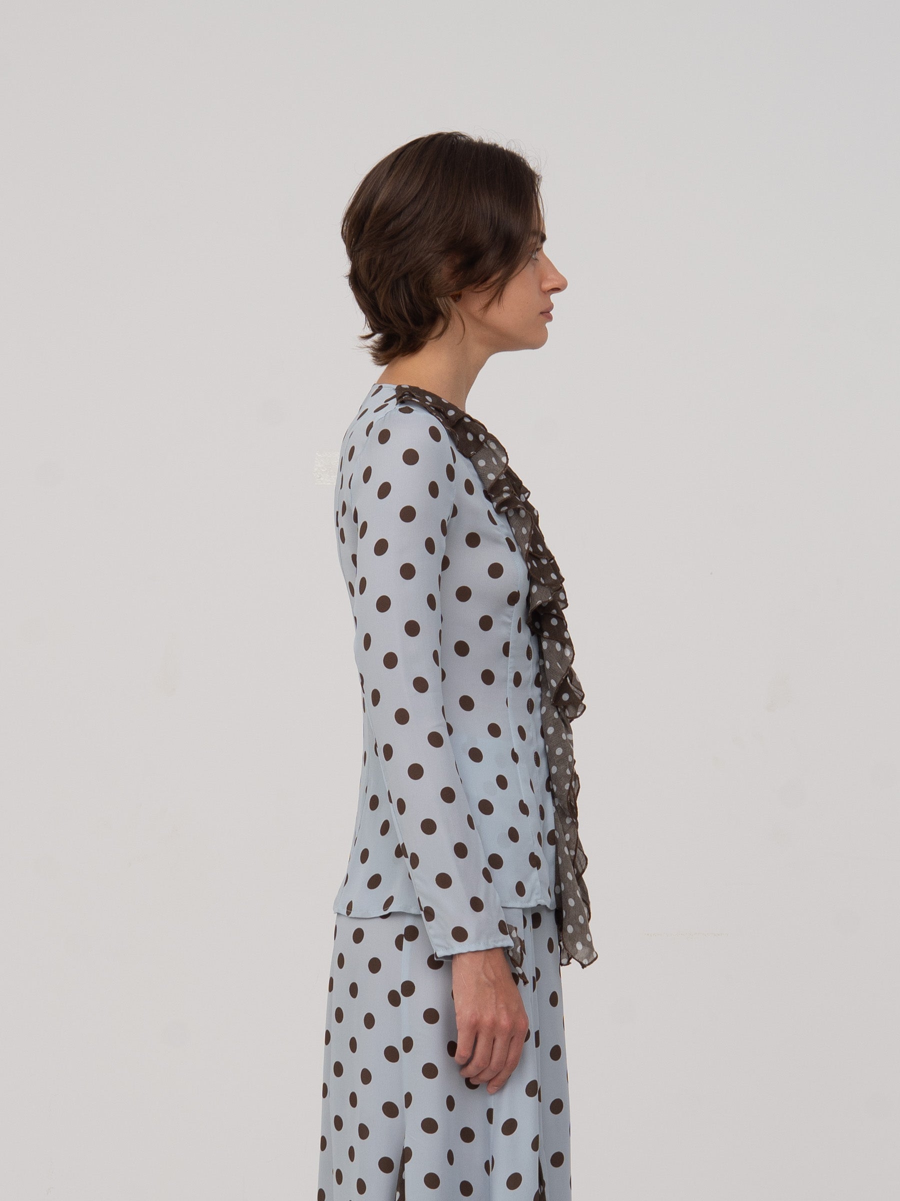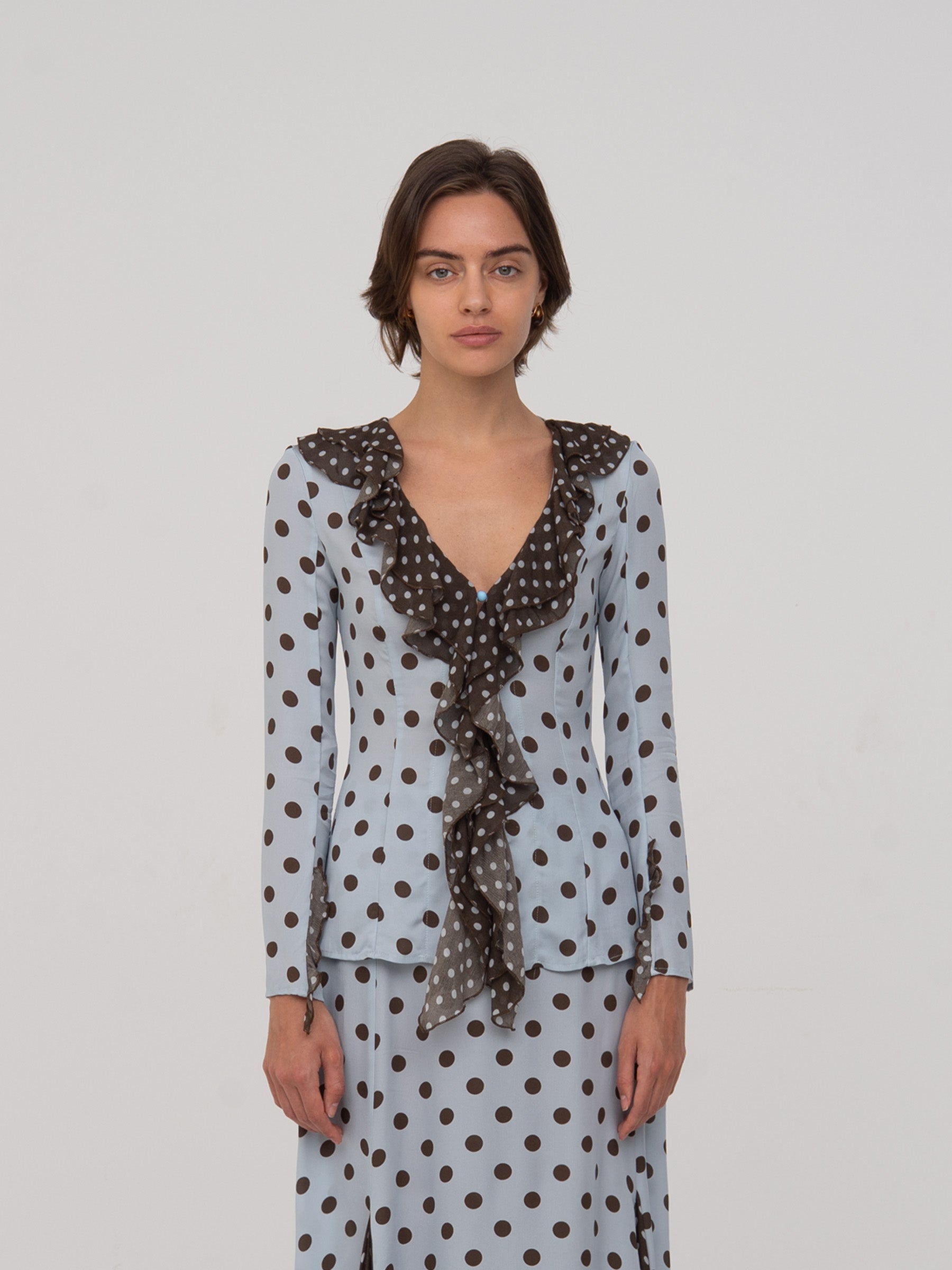 Blusa de manga larga en celeste con lunares marrón oscuro. Volante en cascada desde el escote en “V” hasta el bajo. Detalles en tejido de contraste marrón con lunares claros en cuello, volantes y centro delantero.