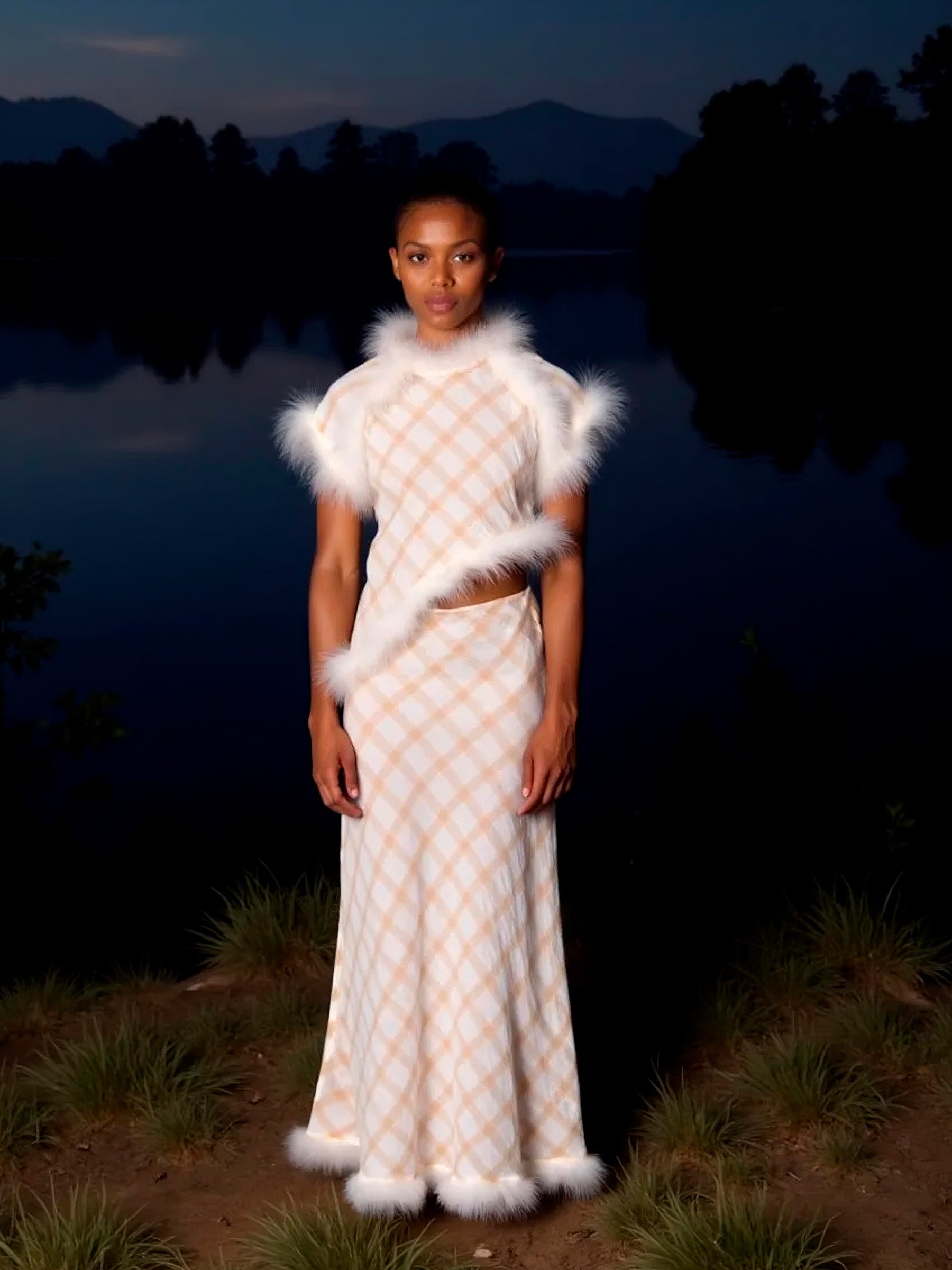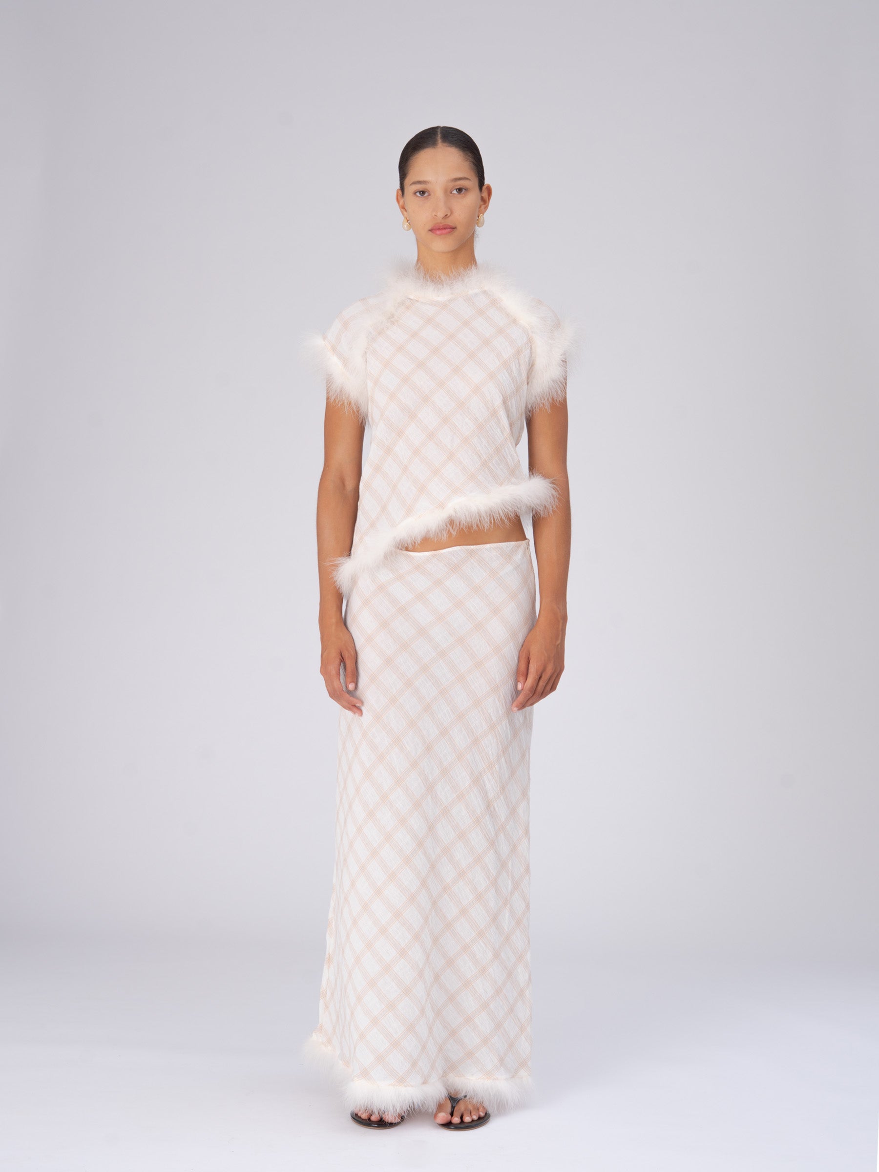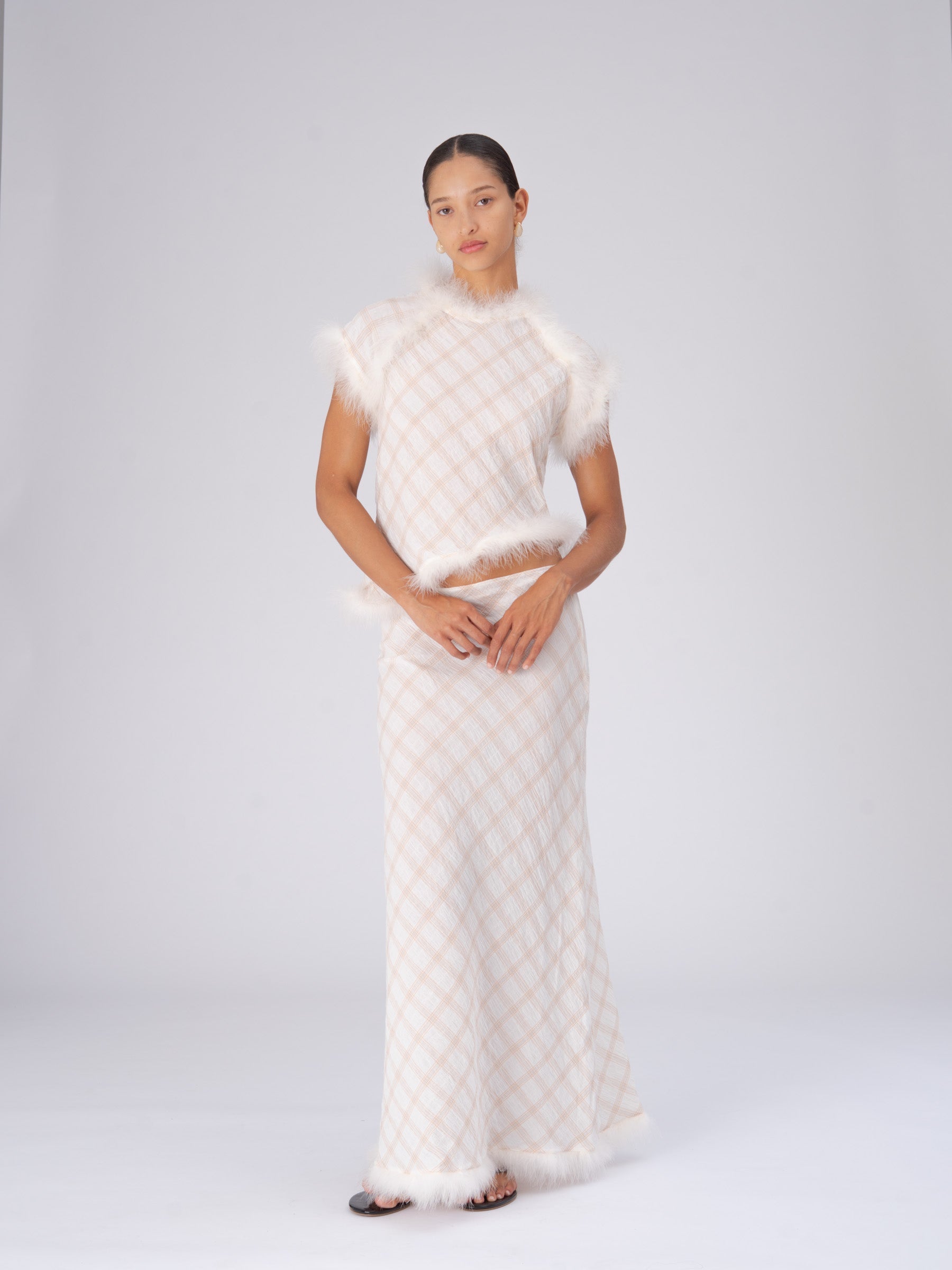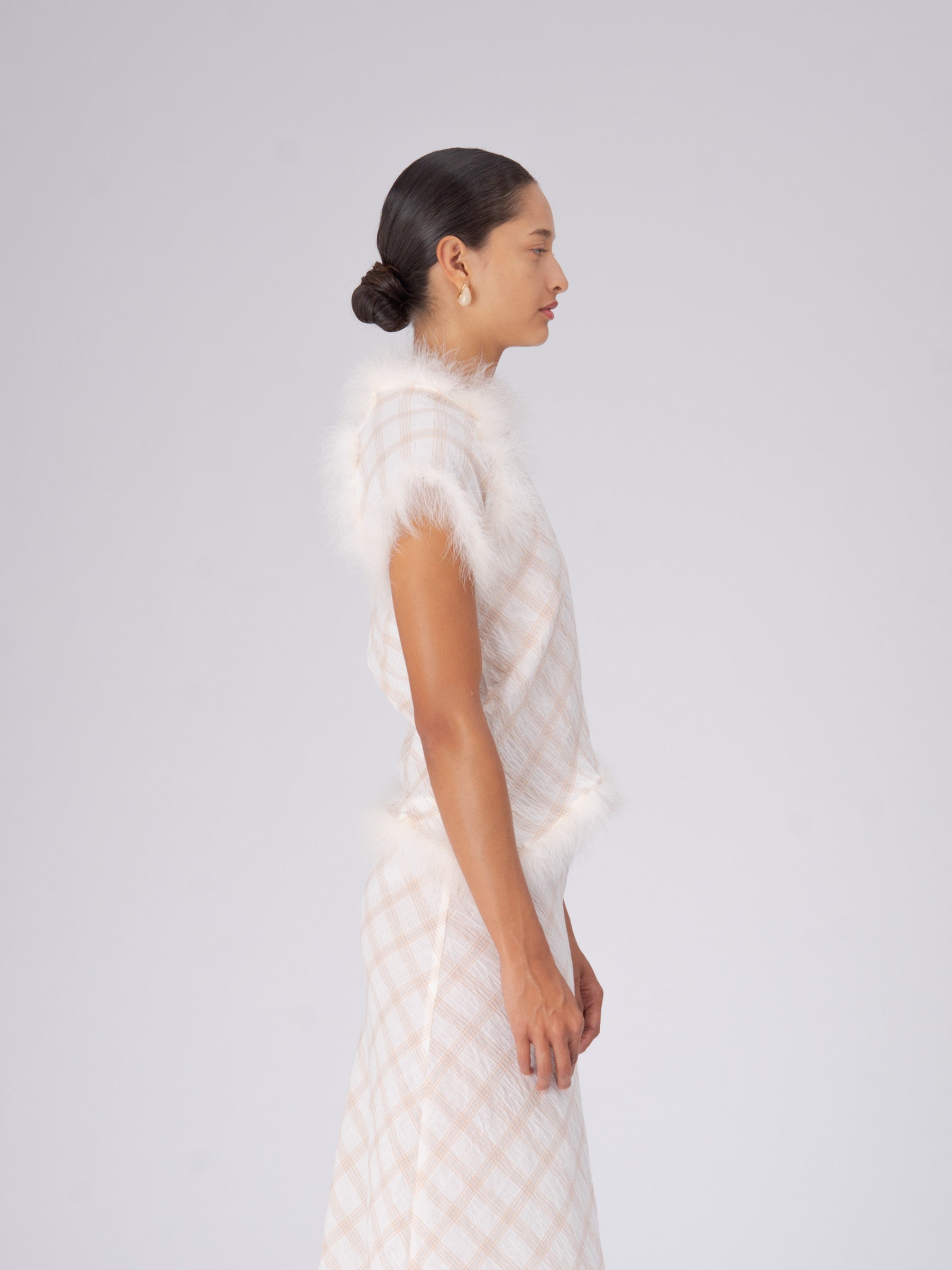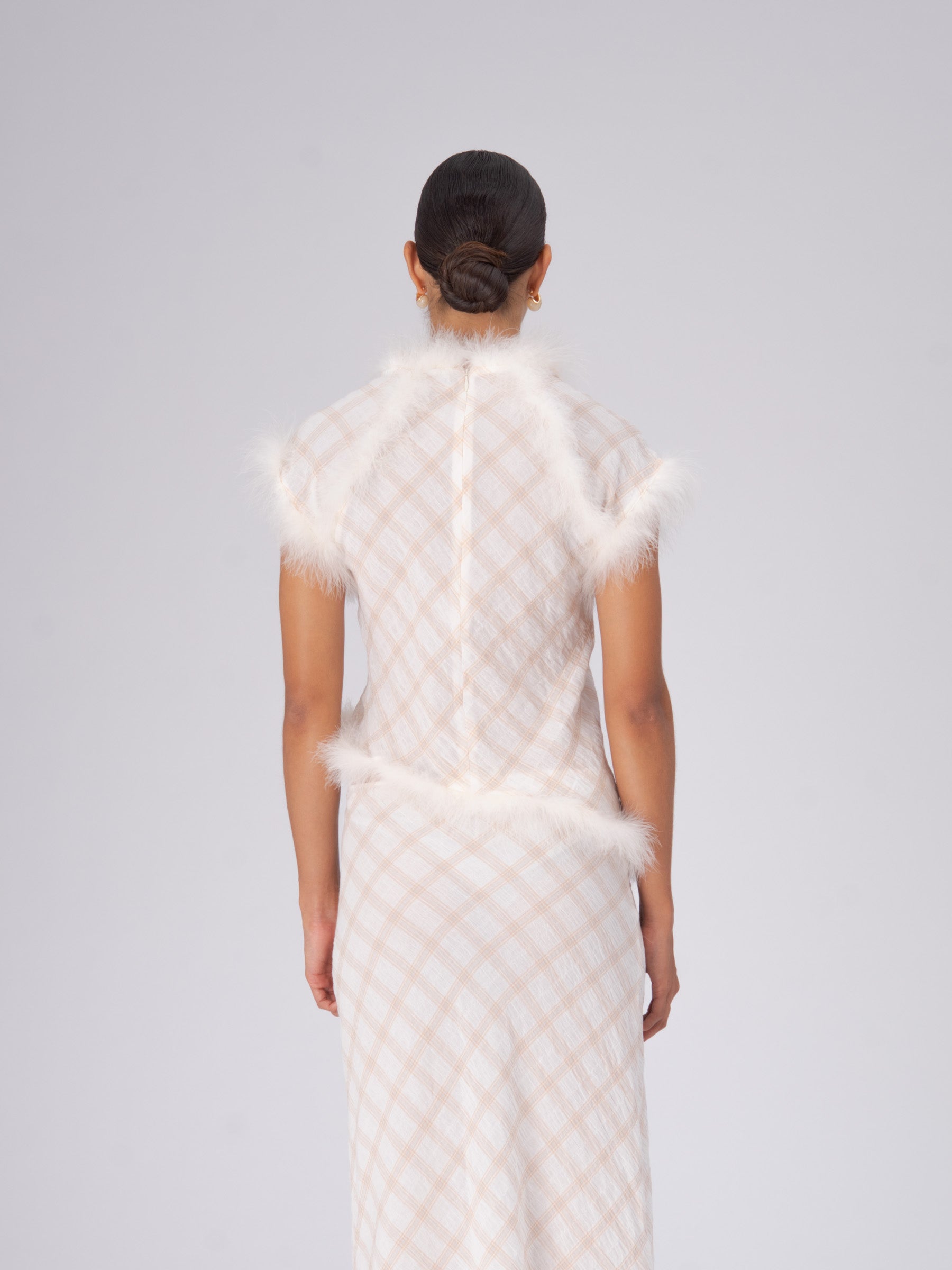 Top asimétrico de cuadros con detalles de plumas en sisas, cuello y bajo. Cierre con cremallera invisible en la espalda.