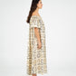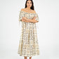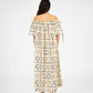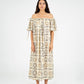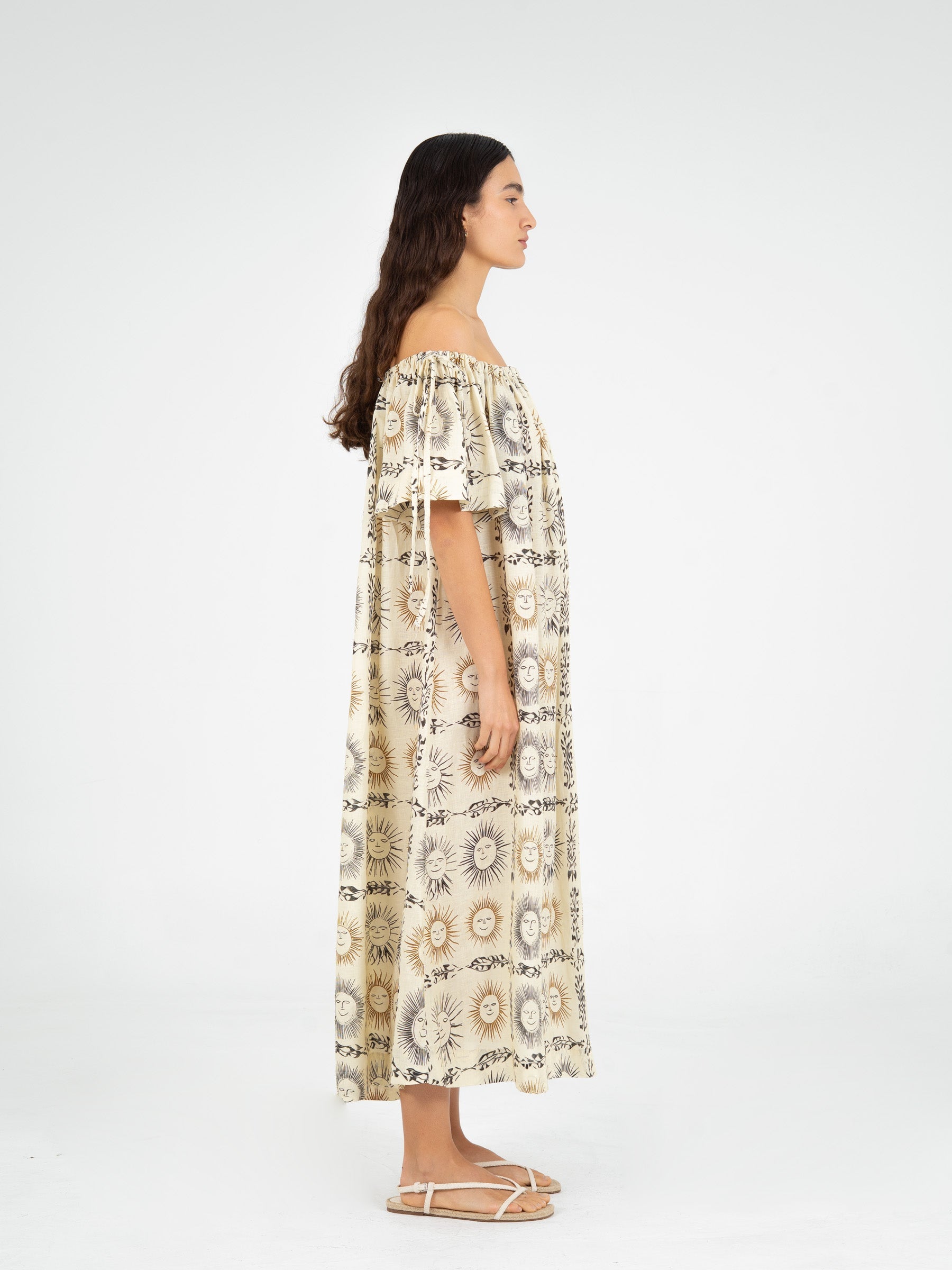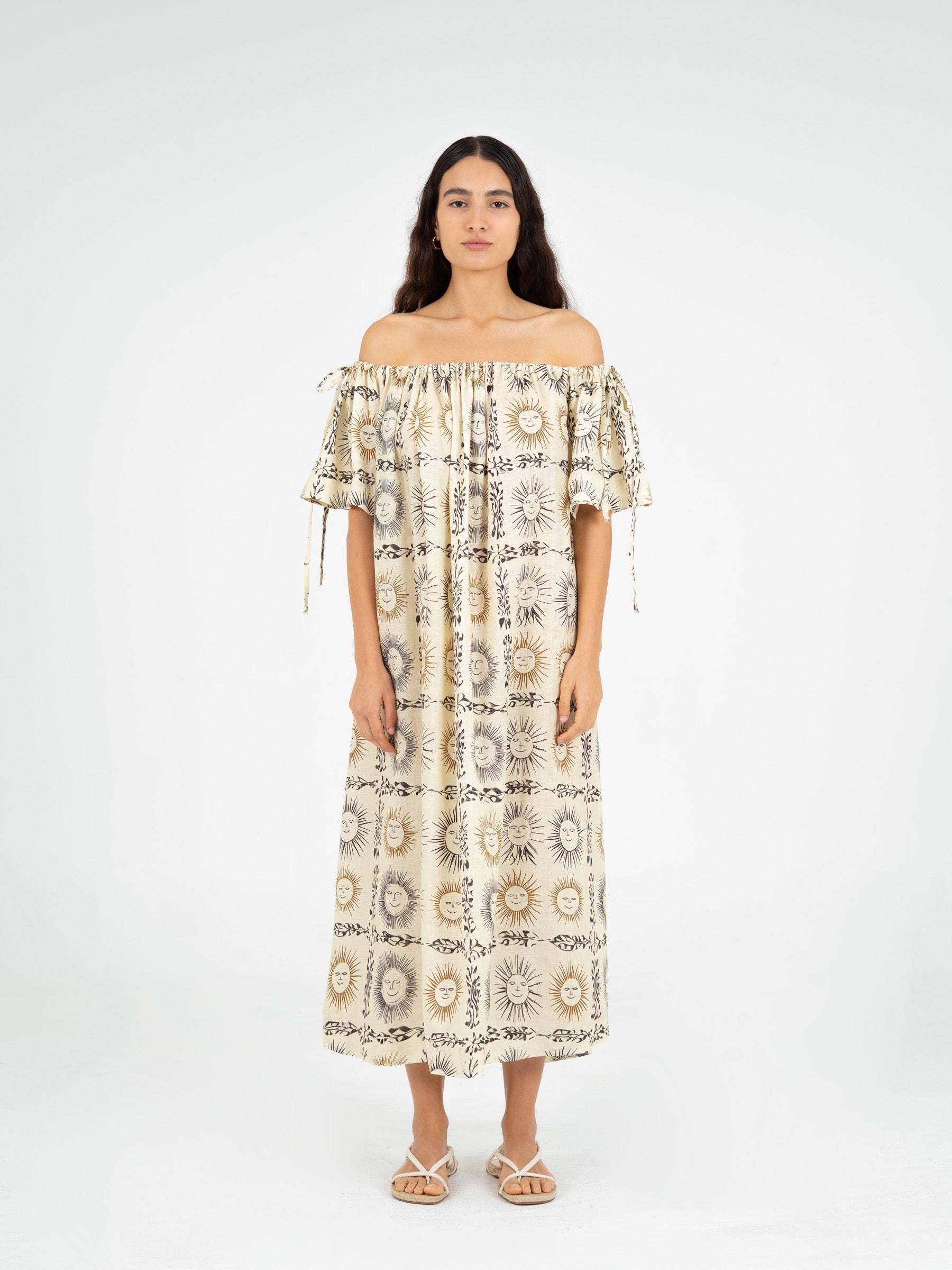 Vestido largo de silueta relajada, con estampado de soles en una paleta de tonos neutros. El diseño presenta escote estilo bardot con fruncido elástico, los hombros al descubierto y mangas cortas con lazos ajustables.