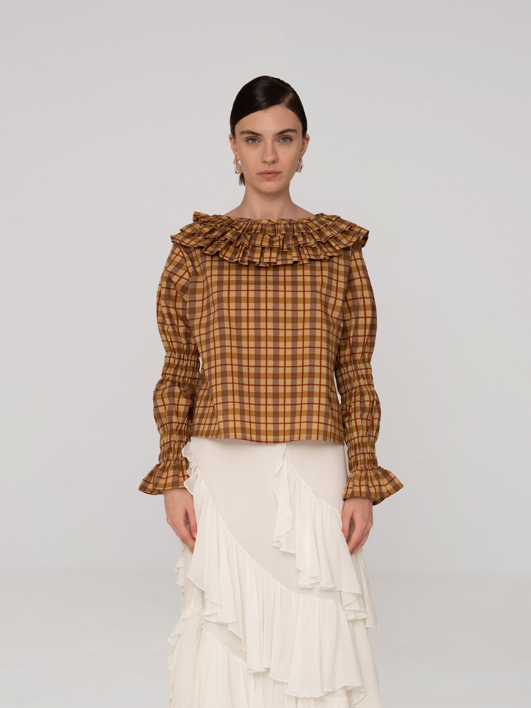 Blusa con estampado de cuadros, cuello con doble volante y puños fruncidos. La silueta es recta y corta.